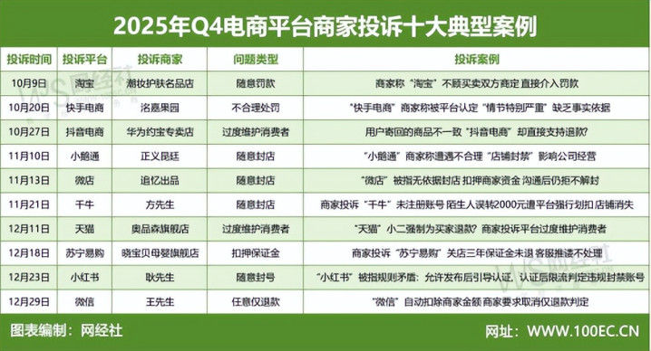 1月7日最好的配资公司,依据网络消费纠纷调解平台“电诉宝”商家投诉通道Q4受理的全国电商平台大量商家投诉案例,网经社电子商务研究中心例行发布《2025年Q4电商平台商家投诉数据报告》。
