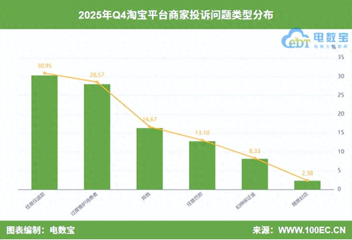 据“电诉宝”显示,四季度淘宝平台涉及的商家投诉问题类型主要集中在:任意仅退款(30.95%)、过度维护消费者(28.57%)、任意罚款(13.10%)、扣押保证金(8.33%)、随意封店(2.38%)。