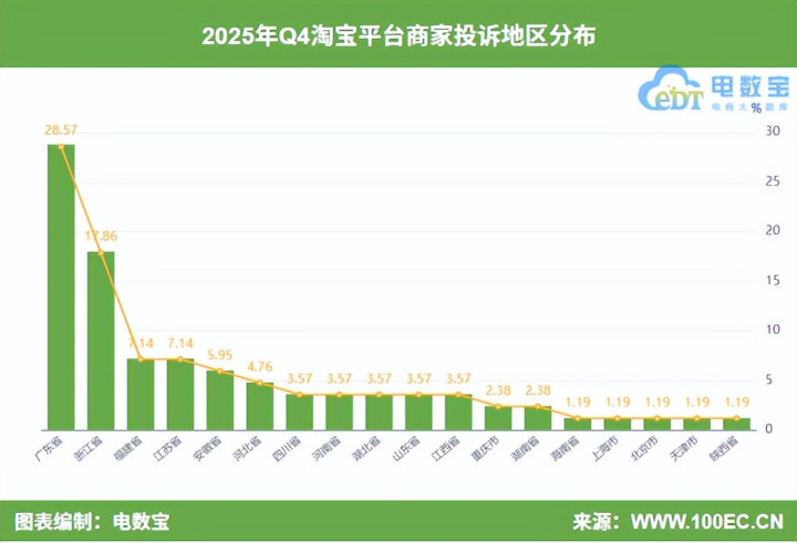 四季度,投诉淘宝平台的商家注册地区TOP5依次为广东省(28.57%)、浙江省(17.86%)、福建省(7.14%)、江苏省(7.14%)、安徽省(5.95%)。