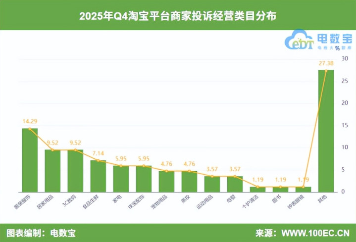 四季度,投诉淘宝平台的商家经营类目TOP5依次为服装服饰(14.29%)、居家用品(9.52%)、3C数码(9.52%)、食品生鲜(7.14%)、家电(5.95%)。