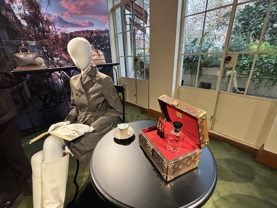 露台,是这家体验店的最佳景观位。透过窗棂,一侧是上海里弄的日常街景——梧桐枝丫掩映着邻家的红瓦屋顶;室内,墙上是巨幅巴黎街头图片,奥斯曼建筑的穹顶与咖啡馆的霓虹仿佛触手可及。
